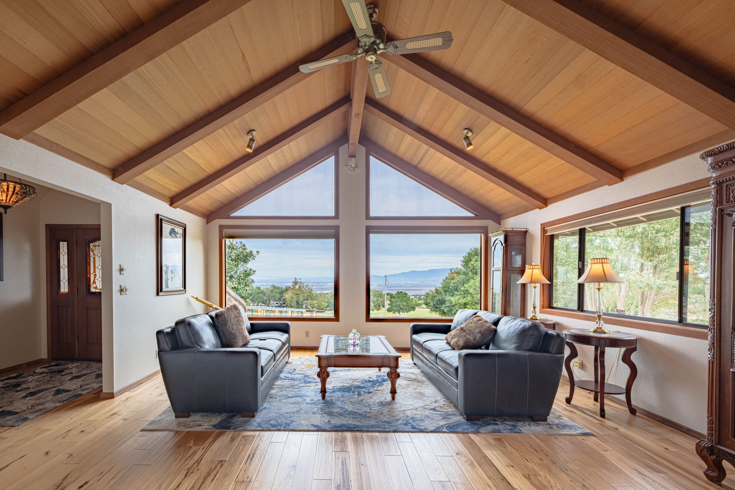 From the moment you step inside, you’ll be captivated by the soaring wood-vaulted ceilings, expansive picture windows, and the panoramic views of the Salinas Valley and surrounding mountains. Nearly every room in the home offers a view—whether it’s the twinkling city lights at night or peaceful morning sunrises over the hills.