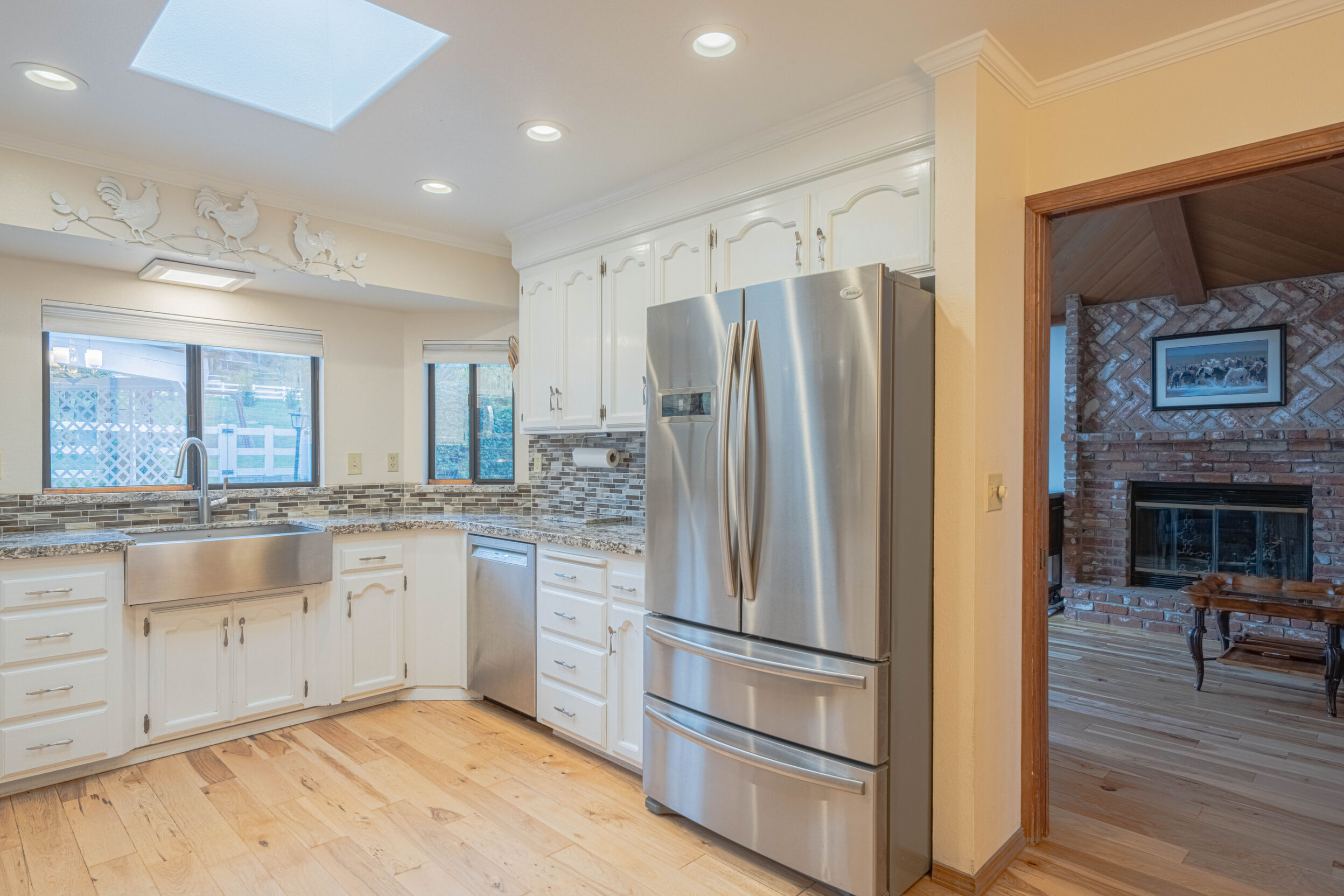 The interior is warm and inviting, featuring gorgeous hickory flooring through most of the home and a thoughtfully updated kitchen with granite counters, stainless steel appliances, and bright white cabinetry that perfectly complements the natural light. The open floor plan flows easily between the living and family rooms, making it ideal for everyday living or entertaining family and friends.